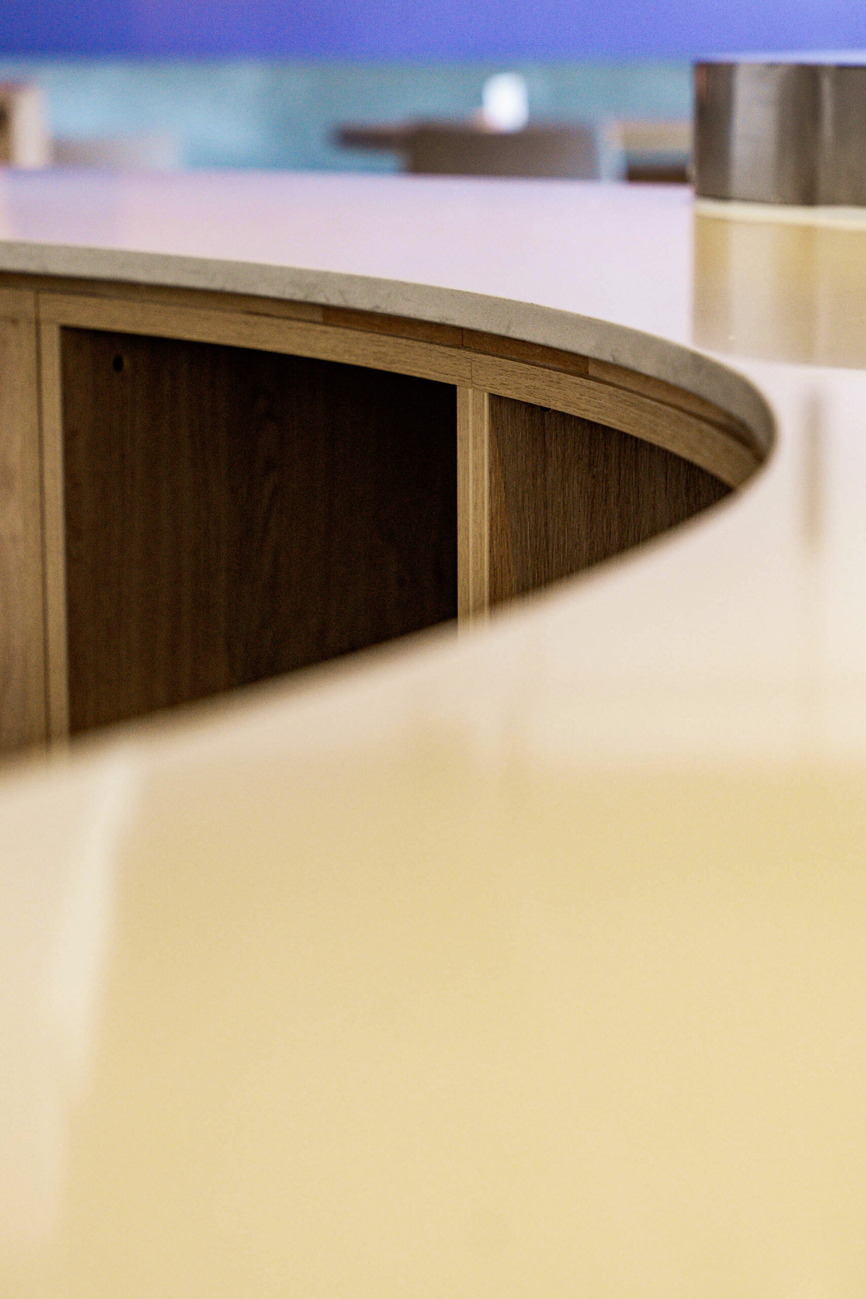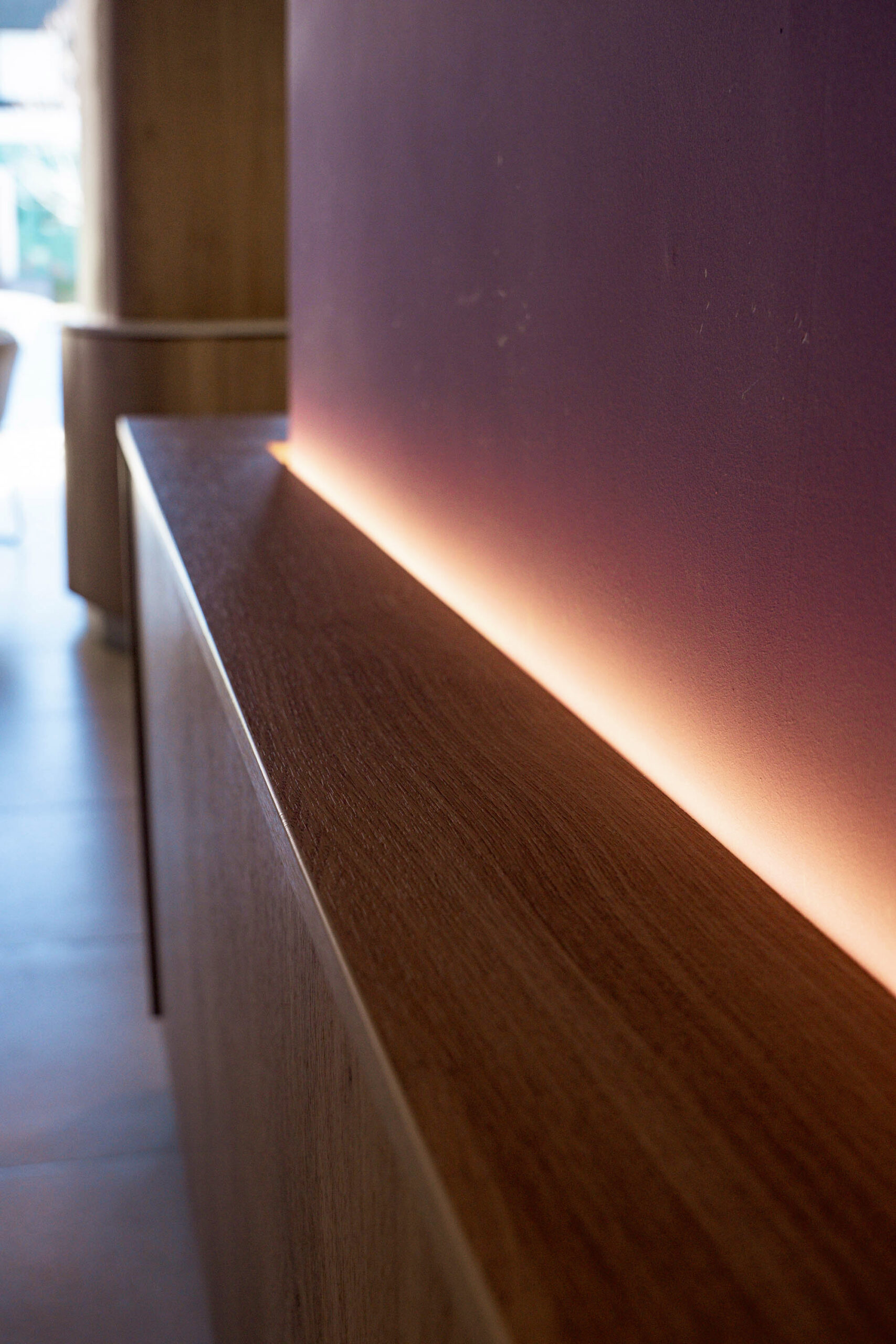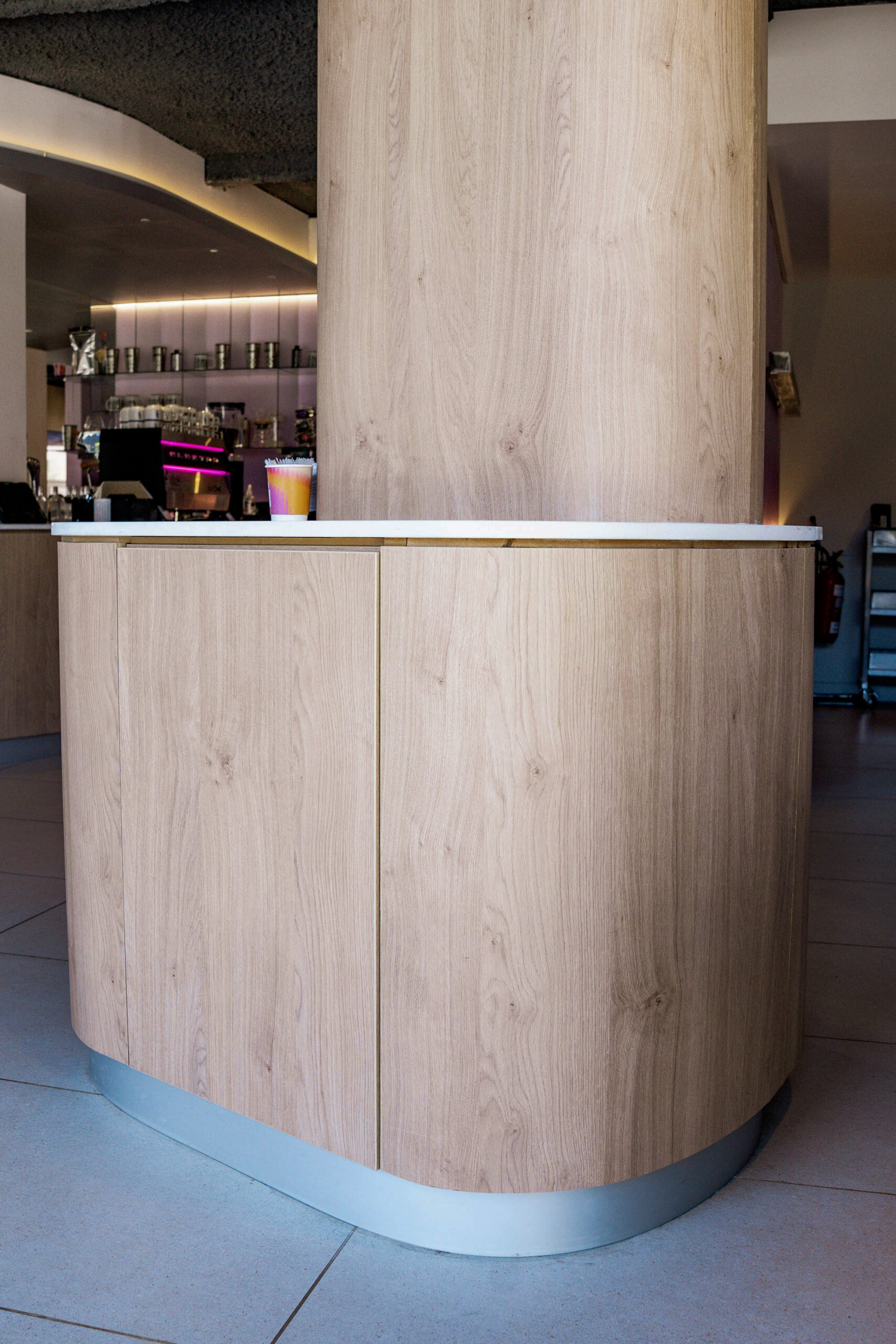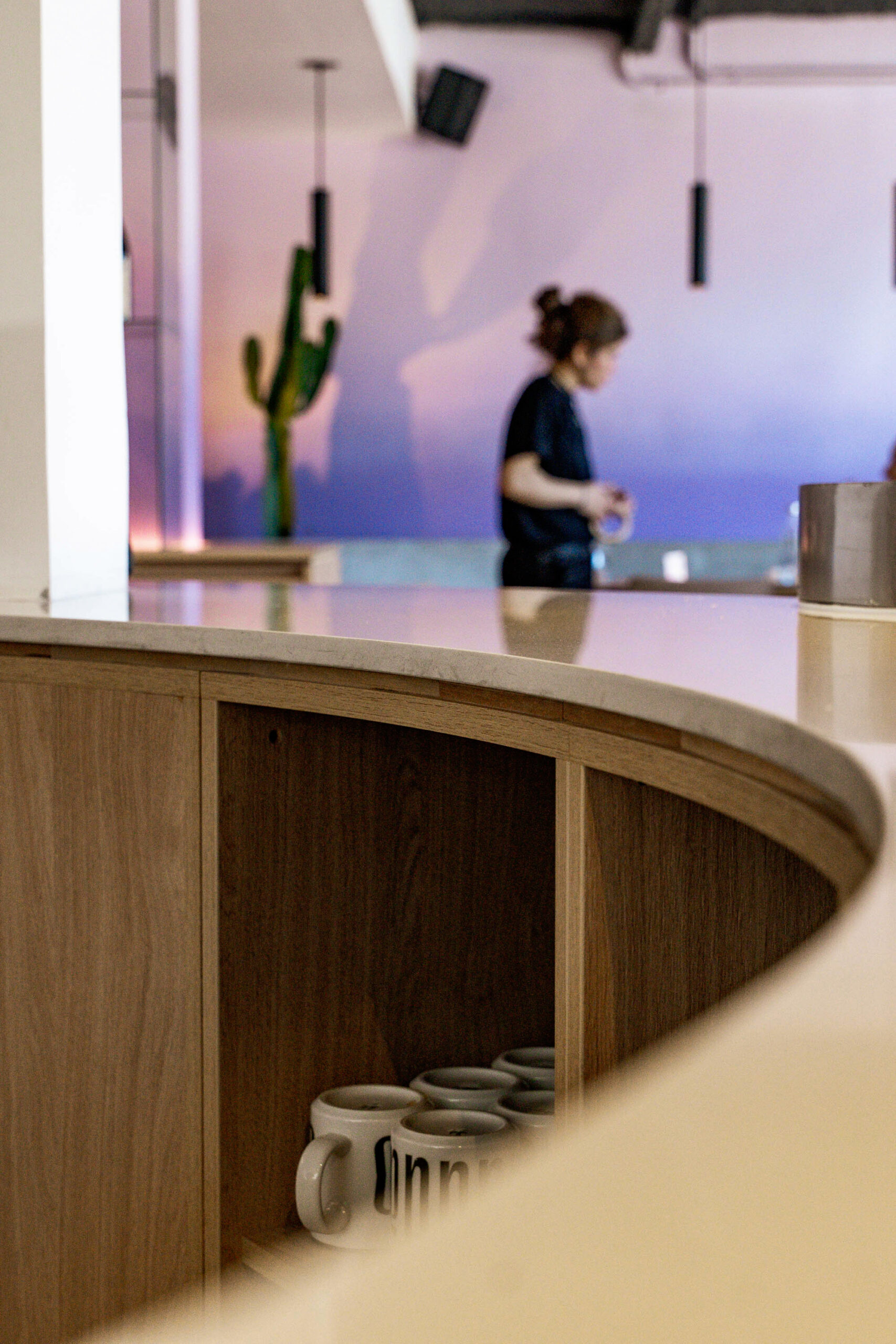 PROYECTO BAR CIUDADANO Diseño y dirección: @Mad_tecture@unmedio Ph: Santi Rocchietti Mobiliario y revestimientos curvos construidos en melamina Roble Kendall. Iluminación led.